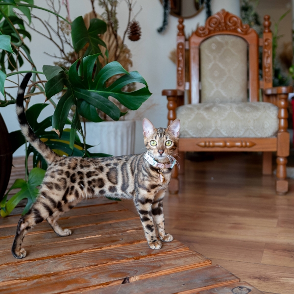 Bengal F4 carinhosa, destemida e muito inteligente. Treinada para passear com guia em lugares abertos (ex.: praças) e responde a comandos como “sentar”. Tem uma pelagem linda e brilhosa com rosetas bem definidas. Veio de um excelente gatil em SP de um padreador Spotted Brown e matriz Silver. Aurora já participou de ensaios fotográficos e uma filmagem para comercial. Uma excelente gata e parte da família.