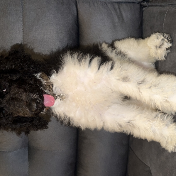 Poodle standard filhote, preta e branca com nome de Cruella